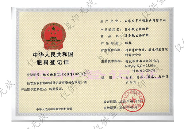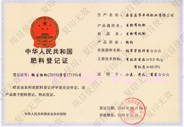 石家莊市豐碩肥業有限公司是一家集新型肥料的研發、制造、營銷、服務于一體的高新技術企業,公司自2008年創辦以來,一直致力于新型肥料的技術研發和市場推廣。公司組建了豐碩新型肥料研究中心(院士專家企業工作站),自主知識產權研發團隊專業科研人員20余人,獲得了多項肥料國家發明專利。公司目前已擁有發酵類有機肥、微生物菌劑、生物有機肥、土壤調理劑、大量元素水溶肥、含腐植酸肥料、含氨基酸肥料、中微量元素肥料等8大品類,“金維克”、“豐碩沃農”等2大自有品牌,擁有20多個暢銷品種。目前,我公司已經通過了“ISO9001 質量管理體系認證”、“ISO14001 環境管理體系認證”、“OHSAS18001 職業健康管理體系認證”。...